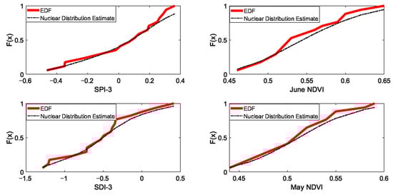 Plots of empirical distribution functions and estimates of kernel distributions for SPI-3, SDI-3, May NDVI, and June NDVI.