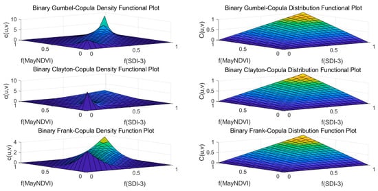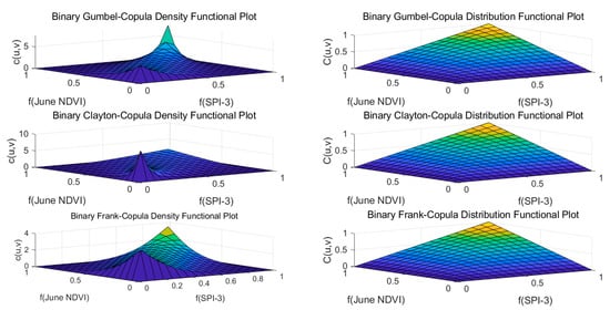 where denotes the copula function; F denotes the cumulative distribution probability of the functional distribution; and and denote the cumulative marginal distribution function of hydrological drought or meteorological drought and vegetation cover, respectively.