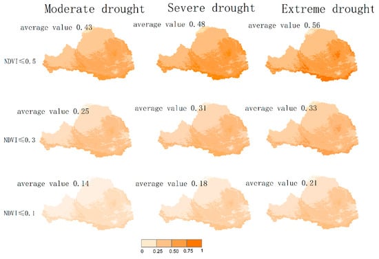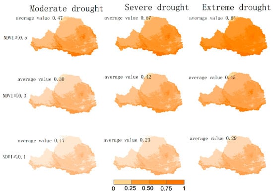Based on the derivation of Equations (15) and (16), the magnitude of the conditional probability of loss of vegetation condition < 0.50, 0.30, and 0.10 under different drought severities were calculated (Figure 13 and Figure 14); average results are detailed in Table 5 and Table 6. Changes in vegetation cover under different drought scenarios were assessed by quantifying the probability of loss of vegetation, which differed under different drought scenarios. The probabilities of loss of vegetation characterized by NDVI < 0.50, 0.30, and 0.10 preset points of extreme drought were 0.56, 0.33, and 0.21, respectively; values for severe drought were 0.48, 0.31, and 0.18, respectively, and those for moderate drought were 0.43, 0.25, and 0.14, respectively. For the hydrological drought scenario, the probabilities of vegetation loss characterized by NDVI < 0.50, 0.30, and 0.10 for extreme drought were 0.64, 0.45, and 0.29, respectively; these values are lower than those for the severe drought scenario (0.47, 0.30, and 0.17, respectively). We conclude that with intense drought, vegetation is more susceptible to influence, and the more obvious any change in vegetation cover will be. Additionally, vegetation status is more sensitive to hydrological than meteorological drought (hydrological drought more directly affects vegetation cover).