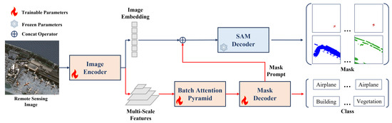 The structure of RSPS-SAM. A Batch Attention Pyramid and a Mask Decoder are added to SAM, with the improvements marked by red lines. These enhancements include the addition of a Batch Attention Pyramid and a Mask Decoder. During the training process, SAM’s pre-training weight is adopted, and the parameters of the SAM Decoder are frozen so that they will not change. Other network parts participate in the training normally, and different parameter updating methods are marked with different colors and icons in the figure.