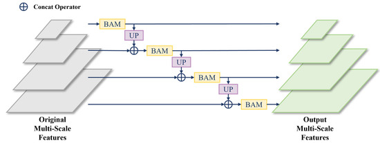 Here, BAM denotes the computation of the Batch Attention Module, is the output result of the previous level’s features, and is set to . The final multi-scale feature output of the Batch Attention Module is composed of the output features from each level.