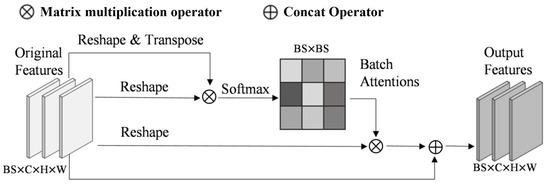 The structure of the BAM is shown in Figure 4. This module directly calculated attention between image patches from 1/4 features , which were extracted from the backbone network. First, the feature was reshaped and transposed to obtain , and , where . Then, was multiplied by . The softmax normalization was applied to obtain the batch attention map , and the calculation process of batch attention can be expressed as follows: