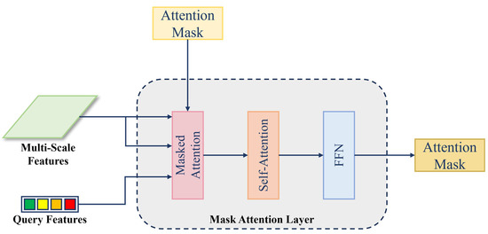 In each Mask Attention Layer, the inputs include multi-scale features, query features, and an attention mask. The layer primarily computes mask attention and self-attention, followed by a Feed-Forward Network (FFN) layer, which outputs a new attention mask for use in the next layer. The structure of the Mask Attention Layer is shown in Figure 6.