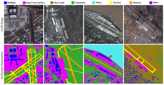 The experiments in this paper were conducted on the RSAPS-ASD, which comprises 102 high-resolution remote sensing images corresponding to 102 typical airports worldwide. Each image had a size of 4000 × 4000 pixels. All data were sourced from the SuperView-1 commercial satellite, which includes one panchromatic band and four multispectral bands (red, green, blue, and near-infrared) with a spatial resolution of 0.5 m. The panoptic segmentation annotations in this dataset categorize ground objects into 9 classes, including Building, Impervious Surface, Bare Land, Vegetation, Water, Taxiway, Runways, and Other, with Airplane singled out as a foreground class, as shown in Figure 7. The dataset can be accessed via the following link: https://github.com/SKLSEIIT/RSAPS-ASD accessed on 26 September 2024.