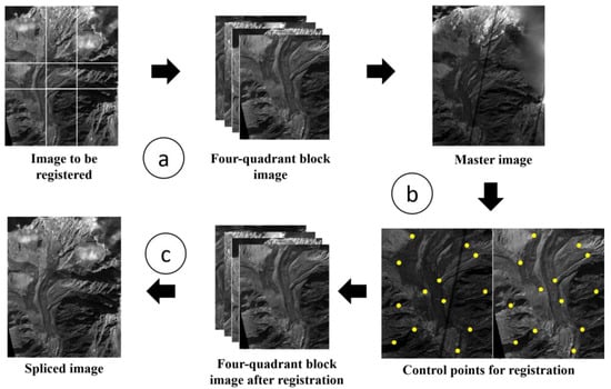 As Sentinel-2 images undergo pre-download calibration, it can ensure a high geocoding accuracy to derive surface horizontal displacement with an optical image correlation technique [45]. However, as the geo-location uncertainties of SV-1 and BJ-2 images are about tens of meters, it is necessary to register them with a certain accuracy before image correlation to estimate the displacement. This study employs a fast and robust matching framework for multimodal image registration. A detailed description of the matching framework can be found in the research [46]. However, the main limitation of cross-platform image co-registration is that it can hardly process the images with large rotation and scale differences. Specifically, the BJ-2 image of 21 December 2017 has a larger geographic location bias, leading to larger registration errors. To address this problem, we propose a four-quadrant block registration strategy, which divides the entire image into four blocks corresponding to the four quadrants. The window size is optimized to obtain reliable displacement results and a common overlap between neighboring windows to maintain spatial consistency across the results. Therefore, the improved registration strategy shown in Figure 3 includes three steps: (a) Segmenting the images into blocks according to four quadrants; (b) Registering each block with the master image using a fast and robust matching framework; (c) Splicing each of the registered blocks into the entire registered image.