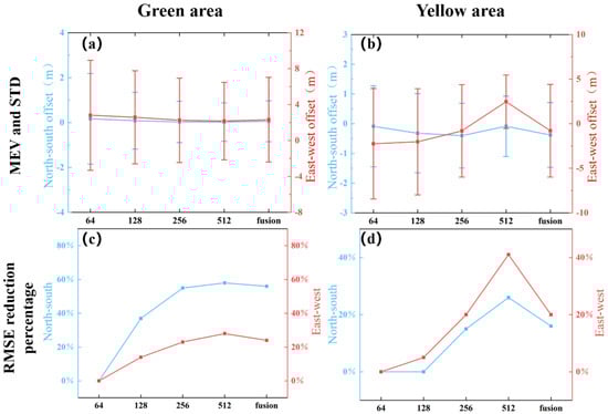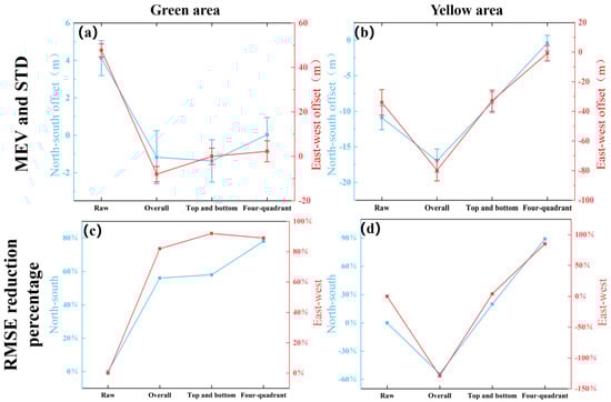 To evaluate the effects of the proposed method, two stable regions are selected as illustrated in Figure 1, where the yellow one corresponds to one larger registration error, while the green one corresponds to one smaller registration error. Figure 5a–d show the MEV, STD, and RMSE reduction percentages for four different strategies in these two regions. We can observe from Figure 5 that the MEV values in both directions of the stable region converge to 0 m, and the STD values significantly decrease, while the percentage of RMSE reduction significantly increases. Specifically, in the green region, the RMSE reductions in the NS direction are 56%, 58%, and 78%, respectively, while in the EW direction, they are 82%, 90%, and 89%, respectively. In the yellow region, the large registration error causes the RMSE value to increase instead of decrease after overall registration. So a decrease in RMSE of -54%, 20%, and 89% was observed in the NS direction, and a decrease of -129%, 4%, and 85% was observed in the EW direction.