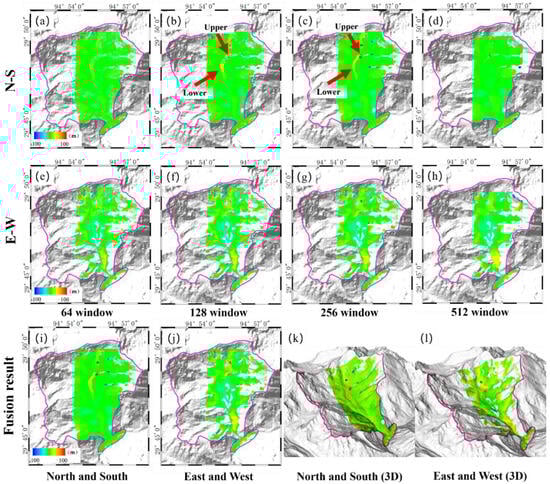 Figure 6 shows the displacement in the north–south and east–west directions using correlation window sizes of 64, 128, 256, and 512 pixels, where the window size of 64 pixels is relatively inadequate to capture the displacement zone, whereas the one with 128 pixels can detect the displacement in the lower part of the glacier, but is less effective in the upper part with large gradient displacements. Meanwhile, the one with 256 pixels can detect the large gradient displacements in the upper part of the glacier well, but it may ignore the displacement magnitude in the lower part. Lastly, the result with 512 pixels can hardly obtain useful information. Therefore, we robustly fuse the displacement from the four windows to achieve a more comprehensive and accurate displacement field. The final displacement in the north–south and east–west directions are presented in Figure 6i,j.