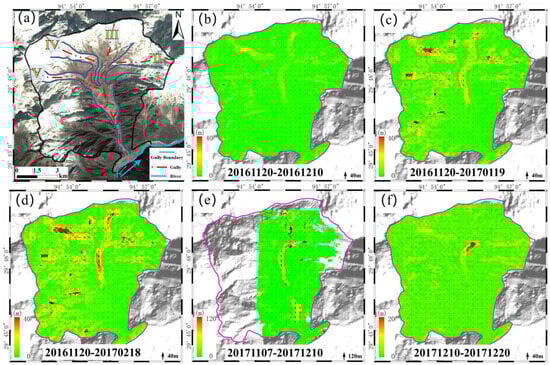 Displacement magnitudes and directions for three stages during the pre-, co-, and post-seismic periods. (a) Show the gully distribution with I–V and the direction of the glacial displacement. (b–d) are the pre-seismic displacement field from Sentinel-2 images, (e) the co-seismic high-resolution displacement field, (f) the post-seismic displacement field from Sentinel-2 images.