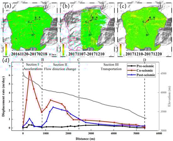 To reveal the correlation between the Milin earthquake and the Sedongpu glacier movement, we calculate the daily displacement rates during three stages: pre-seismic, co-seismic, and post-seismic. The displacement rates along profiles A–D during the three stages are presented in Figure 9d. The direction of glacier displacement is indicated by black arrows in Figure 9.