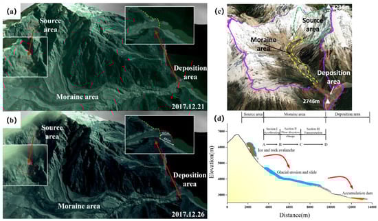 Figure 10a,b show the surface changes before and after the disaster chain based on Planet satellite images acquired on 21 December 2017 and 26 December 2017. Figure 10c,d show the failure pattern of the disaster chain in the Sedongpu basin, which can be divided into three different sections: the source area, the moraine area, and deposition area [58]. Firstly, about 0.33 km2 of ice and rock in the source area collapsed; secondly, according to the monitoring of the moraine area in this paper, the Milin earthquake triggered glacier movement, leading to a cumulative displacement of up to 226 m during the co-seismic and post-seismic periods within 33 days; lastly, 1 million m3 of sediment transported from the moraine area was finally deposited at the intersection, which pushed the sediment to the river by 200–450 m to form a barrier dam about 0.53 km2 with an elevation of 2746 m in the Yarlung Tsangpo River. It completely blocked the main channel, raising the water levels by approximately 2 m [59].