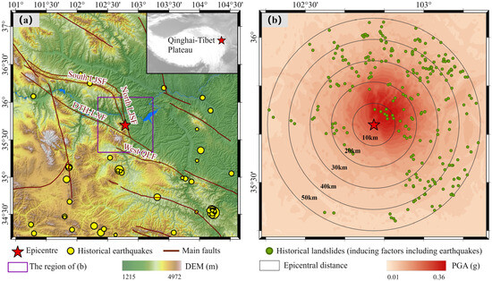 Tectonic, geomorphic setting, and historical disaster of the Jishishan Earthquake. (a) Tectonic background map of the Jishishan earthquake area. (b) Distribution of PGA and historical landslides (inducing factors, including earthquakes) within 50 km of the epicenter of the Jishishan earthquake. LJSF: Lajishan fault, RYSF: Riyueshan fault, QLF: Qinling fault, DTH-LXF: Daotanghe-Linxia fault.