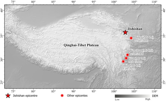 On 18 December 2023, a destructive earthquake (MS 6.2) struck Jishishan County, Gansu Province, at Beijing time of 23:59 (UTC 15:59, 18 December). The Jishishan earthquake is located at 102.79°N, 35.70°E, with a hypocentral depth of 10 km. The largest slip is located approximately 6.3 km NNW of the epicenter, the highest instrumental intensity is IX-X on the Mercalli scale, and the aftershocks are mostly distributed in the northwest direction within 20 km of the epicenter [45]. The Jishishan earthquake had a shallow focal point and occurred in the transition zone between the Qinghai-Tibet Plateau and the Loess Plateau (Figure 1). In this region, the soil layer was thick, and the altitude was high, leading to a noticeable amplification effect of seismic energy, resulting in significant surface damage [46,47]. The Jishishan earthquake impacted 772,000 individuals in Gansu and Qinghai provinces, resulting in the loss of 151 lives and injuries to 983 people. The disaster led to the collapse of 70,000 houses, severe damage to 99,000 houses, and general damage to 252,000 houses. The direct economic loss was estimated at CNY 14.612 billion (https://www.mem.gov.cn/xw/yjglbgzdt/202401/t20240120_475696.shtml, accessed on 20 January 2020).