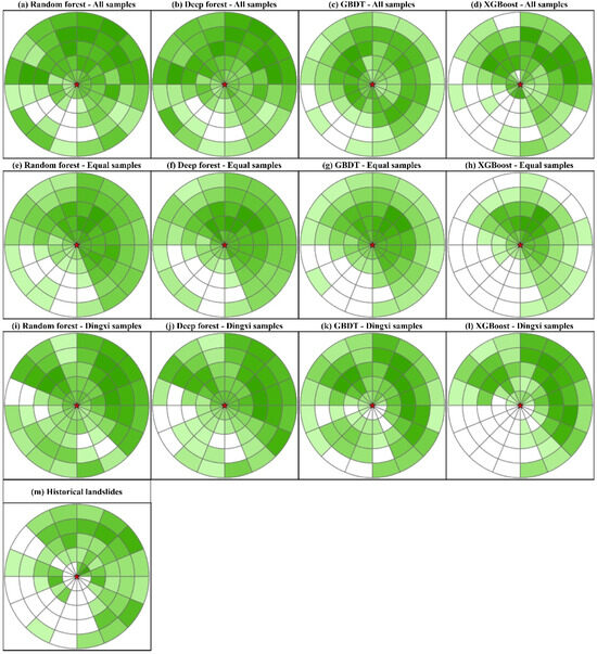 The comparison of four ML algorithms reveals that RF and DF exhibit a higher tolerance for EQIL determination, with broader coverage of high susceptibility. On the other hand, GBDT and XGBoost have stricter determination conditions and a more concentrated range of assessed high susceptibility. While the spatial pattern distribution of various training samples generally exhibits a higher concentration in the northeast direction, there are notable differences in the detailed distribution. The high-susceptibility areas associated with “All samples” are primarily clustered in the north and northeast directions, extending over distances exceeding 20 km. In contrast, the outcomes based on “Equal samples” are focused in the northeast direction but within a narrower range of less than 30 km. The findings from the “Dingxi samples” display a scattered distribution with a southwest direction being more susceptible compared to the other datasets.