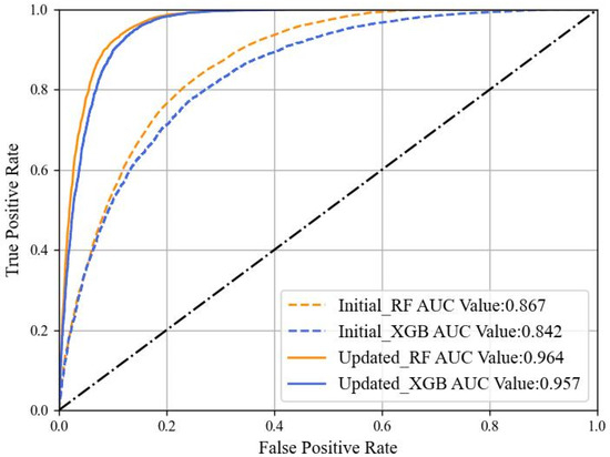 In addition to the visual representation of spatial distribution, which effectively demonstrates the enhancement of the model’s performance, the Receiver Operating Characteristic (ROC) curve and Area Under Curve (AUC) values depicted in Figure 7 provide a quantitative measure of this improvement. Both algorithms witnessed a notable increase of 0.1 in their respective AUC values. What is even more remarkable is the significant improvement in the Accuracy (ACC) value, with the random forest model experiencing an increase of 0.4, while the XGBoost model saw a commendable improvement of 0.37.