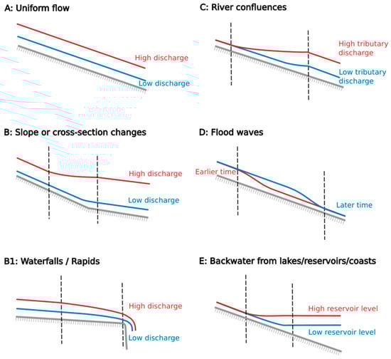 Hydraulic phenomena causing time-variable water surface slope in rivers. Vertical dashed lines delineate the zone of significant WSS change. (A) River reach with uniform flow. (B) Abrupt conveyance change. (B1) Waterfalls or rapids. (C) Reaches upstream of river confluences. (D) Flood waves traveling through the river reach. (E) Backwater effects upstream of lakes, reservoirs, or the ocean.