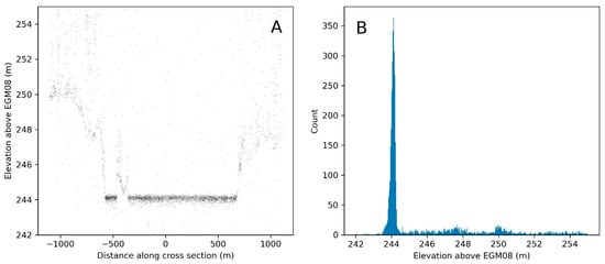 Processing of ATL03 river crossings. Example river crossing of the Peace River near Vermillion Falls on 3 June 2019 (ATL03 file name: ATL03_20190306160236_10420202_006_02_gt1l). (A): ATL03 elevation points along the cross section. (B): Histogram of ATL03 heights along cross section.