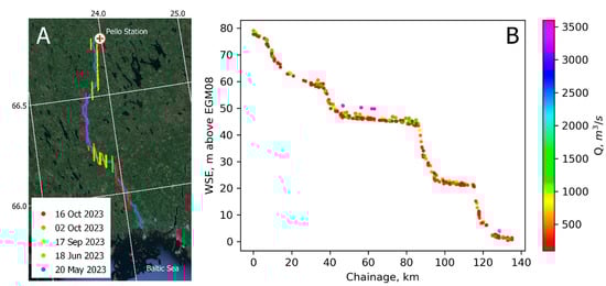ATL03 water surface elevation profile for the Torne River. (A): Base map of the area with selected ICESat-2 tracks. Background is Google satellite imagery. Coordinate grid as decimal latitude and longitude (EPSG 4326). (B): ICESat-2 WSE data versus river km from Pello. Pink datapoints are from 20 May 2023. Pello in-situ discharge data [29] show a 100-year flood event on this day.