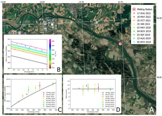 A typical uniform flow site is the Pfelling gauging station (Lon: 12.7472, Lat: 48.8797) on the Danube River in Germany (Figure 4). In-situ discharge data are available from the GRDC online database [26] and has been used in this analysis. Figure 4 illustrates the available ICESat-2 crossings and the location of the in-situ station. Panel B provides ICESat-2 water surface elevation estimates as dependent on chainage and river discharge. We observe a close match between the observed water surface elevations and the water surface elevations predicted by the uniform flow equation. Panels C and D provide observed water surface elevations and water surface slopes for the in-situ station location as well as simulated WSE–discharge and WSS–discharge relationships. The WSE observations along the river were extrapolated to the station location assuming a uniform WSS. It is evident that the data are in good qualitative agreement with the uniform flow assumption—i.e., increasing WSE with discharge, following a power law, and a uniform WSS with discharge. In summary, in case A, we expect increasing WSE with increasing discharge and a constant WSS with increasing discharge. ICESat-2 data from the Pfelling site are in qualitative agreement with this conceptual understanding.
