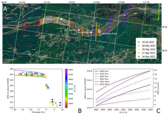 Vermillion Falls on the Peace River. (A): Base map of the area with selected ICESat-2 tracks. Background is Google satellite imagery. Coordinate grid as decimal latitude and longitude (EPSG 4326). (B): Simulated (solid lines) and ICESat-2 (dots) WSE as dependent on GLOFAS discharge. (C): Simulated WSE and WSS at three points upstream of the falls.