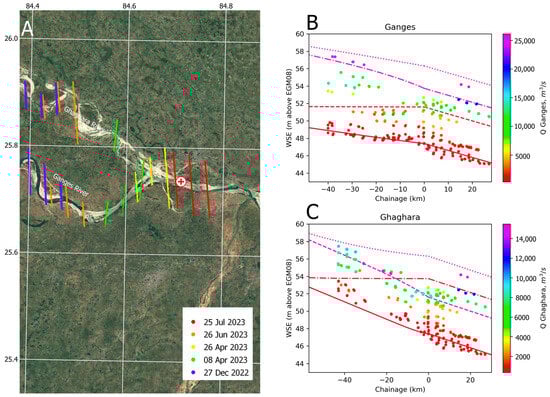 Confluence between the Ganges and the Ghaghara Rivers. (A): Base map of the area with selected ICESat-2 tracks. Background is Google satellite imagery. Coordinate grid as decimal latitude and longitude (EPSG 4326). (B): Simulated (lines) and ICESat-2 (dots) WSE in the Ganges as dependent on Ganges River discharge (GLOFAS). (C): Simulated (lines) and ICESat-2 (dots) WSE in the Ghaghara as dependent on Ghaghara River discharge (GLOFAS). In (B,C), solid lines indicate simulation results for minimum flow in both Ganges and Ghaghara, dotted lines indicate maximum flow in both Ganges and Ghaghara, dashed lines indicate minimum flow in Ganges and maximum flow in Ghaghara, and dashed-dotted lines indicate maximum flow in Ghaghara and minimum flow in Ganges.
