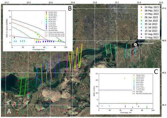 On 6 June 2023, the Kakhovka dam on the Dnipro River in Ukraine (Lon: 33.3657, Lat: 46.7760) collapsed, creating a massive flood wave on the river reach from Kakhovka to the Black Sea. Water levels just downstream of the dam rose up to 16 m [30]. Several high-quality ICESat-2 tracks over the river reach are available for the period of interest, including one crossing on 6 June immediately after the dam break, as shown in Figure 7A. From the ICESat-2 data, it is evident that water levels in the river rose by several meters because of the dam break (Figure 7B) and that the water surface slope increased significantly during the flooding event at locations close to the wavefront (Figure 7C). We used the traveling wave model presented in the methods section to predict water surface slope changes around the wavefront. Assuming a bed slope of 2 cm/km, a Chézy coefficient of 90 m1/2/s, and an effective depth of 0.5 m prior to the flood event, the model predicts a WSS change from 2 cm/km to ca. 12 cm/km during the passage of the wave front, which travels down the river at 1.7 m/s. The available ICESat-2 data show the WSS at around 20 cm/km on 6 June 2023, which is higher than the prediction of the traveling wave model and indicates that the shape of the wavefront is not in steady state at the time and place of the ICESat-2 overpass. The WSS in July–August 2023 is close to zero, indicating quasi-stagnant water (Figure 7C). In summary, the Kakhovka case shows that the range of WSS occurring during the passage of a flood wave can be predicted using the simple traveling wave model presented here. This result can be used for large-scale hydraulic analysis using SWOT and ICESat-2 data, for instance, to predict the maximum expected WSS during the passage of flood waves in global river reaches.
