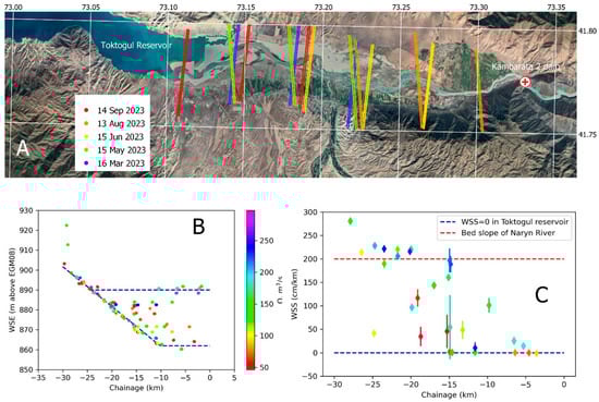 We illustrate the backwater effects from reservoirs for the Toktogul Reservoir on the Naryn River (Lon: 73.2568, Lat: 41.7755) in Kyrgyzstan (Figure 8). Seasonal water level changes in this reservoir are several 10s of meters, leading to significant WSS changes in the backwater-affected zones upstream of the reservoir. The ICESat-2 WSE observations show the reservoir storage dynamics (Figure 8B), and Figure 8C clearly shows the zone of high WSS variability at the interface between river and reservoir. In the downstream portion, i.e., for chainages larger than −5 km, the WSS is always close to zero as this part is always covered by the lake. In the upstream portion, i.e., for chainages between −30 km and −20 km, the WSS is always close to the bed slope of the Naryn River. In river reaches like this one, the water surface elevation and water surface slope are primarily controlled by reservoir storage dynamics, and estimating river discharge from water level is thus problematic and error prone. In summary, WSE and WSS dynamics upstream of reservoirs, lakes, and the sea are shown to depend both on river discharge and water level in the receiving water body. It is important to note that the backwater effects from receiving water bodies can extend far upstream up to hundreds of kilometers in lowland rivers with low bed slopes.