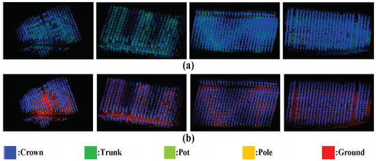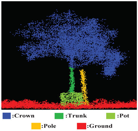 Based on the actual situation, all points were divided into five categories: crown, trunk, pot, pole, and ground. An example of annotation is shown in Figure 5. The visualization ground truths of the four scenes after labeling are shown in Figure 4b. Table 1 provides additional details about the dataset, encompassing the number and size of point clouds for different categories across scenes, the actual area occupied by each scene, and the varying density ranges of point clouds.