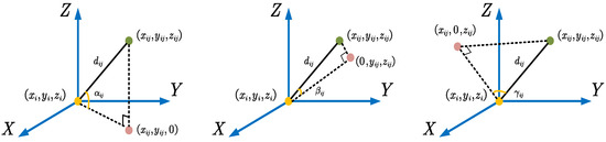 For the proposed model, the direction angle information formed by the line connecting the center point and the neighboring point around the two axes is added at the local feature extraction module. The obtained angles are shown in Figure 7, which can be expressed as follows: