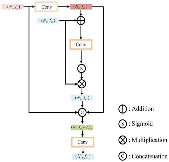 For attention coefficients, larger values typically correspond to more important information, whereas smaller values correspond to less relevant or unimportant information. Therefore, multiplying attention coefficients with the allows for the extraction of important information. After that, modified features, after being multiplied by the attention coefficients, are concatenated with . Then, the final output features from the upsampling feature adjustment module will go through a convolution operation:
