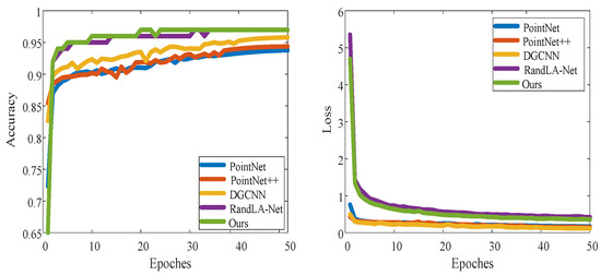 This section presents a comparison of the segmentation performance of the proposed model with several commonly used point-based neural network models, including PointNet [38], PointNet++ [39], DGCNN [40], and RandLA-Net [43]. These four typical models are widely used as comparative models in semantic segmentation tasks on both public datasets and self-made datasets [55,56,57,58,59,60]. Therefore, in this paper, we compare the experimental results with these four models. Experiments were conducted using the self-made point cloud set described in Section 2.1. Area1 was utilized as the testing set, while Area2, Area3, and Area4 were used as the training sets. Figure 11 displays the loss and accuracy curves of all models during the training process, indicating that all models eventually reached steady states. Table 2 presents the value of of all models, as well as the for each category.