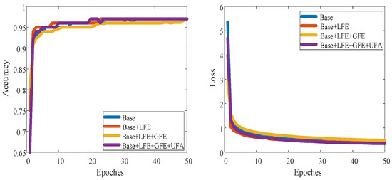 To prove the effectiveness of the proposed local feature extraction (LFE), global feature extraction (GFE), and upsampling feature adjustment (UFA) modules, a series of ablation experiments were conducted. These experiments involved systematically removing each module from the architecture and evaluating the segmentation performances using metrics such as , Precision, Recall, and F1-scores. Similarly, Area1 was utilized as the testing set while the remaining three areas were used as the training sets. Figure 13 shows the training processes of all modified models, where the RandLA-Net model was the base model. The testing results are presented in Table 4 and Table 5.