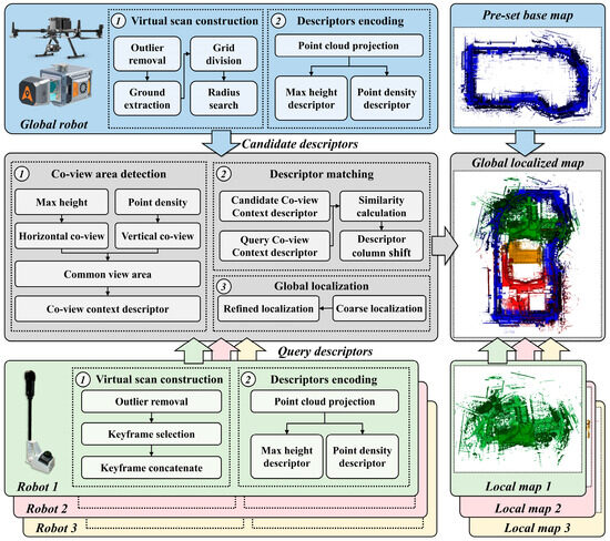 In this section, we present a detailed explanation of the base-map-guided LiDAR localization solution and the co-view context descriptor. The workflow is illustrated in Figure 1. The pre-set base map, serving as a reference scan for mobile robots, can be obtained using ALS or other mapping techniques, whereas the local point clouds of each single robot can be captured using the LiDAR SLAM or single-station laser scanning methods. To begin with, we propose the concept of a virtual scan, including the virtual reference scan (VRS) and the virtual local scan (VLS). They are constructed for both the pre-set base map and the local point clouds and are considered as the processing unit for global localization. The height and density information of the virtual scan points is then leveraged to detect horizontal and vertical co-visible regions and combined to generate the co-view context descriptor. The VRS generates the candidate descriptor, whereas the VLS generates the query descriptor. Subsequently, the similarity between candidate and query descriptors is calculated. This process aids in determining the best matching pair of descriptors, thereby facilitating the estimation of the coarse transformation. Finally, the transformation is refined using the trimmed ICP algorithm to achieve precise global localization for heterogeneous point clouds. Each robot is restored to a coordinate frame that is unified with the base map.