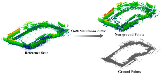 The movement of robots primarily occurs on the ground. Based on this assumption, our approach concentrates the virtual reference stations on the ground to narrow the search space. Therefore, the first step is to extract ground points from the reference scan using the cloth simulation filtering (CSF) algorithm [49], as shown in Figure 2. The CSF algorithm simulates a rigid cloth falling from above onto the surface of an inverted point cloud. The location of the cloth nodes can be determined by analyzing the interactions between the nodes and the corresponding points, thereby generating an approximation of the ground surface. Based on the approximate surface, ground points can be extracted from the original point cloud.