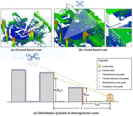 Nevertheless, localizing heterogeneous point clouds remains challenging, and addressing this issue is a central focus of our work., localizing heterogeneous point clouds remains challenging, and addressing this issue is a central focus of our work. In this paper, we develop a novel co-view context descriptor capable of detecting co-visible regions in heterogeneous point clouds. Inspired by the scan context descriptor [6], the co-view context descriptor enables efficient and concise feature encoding of point clouds. In addition to this, it provides adaptability to heterogeneous point clouds—an aspect generally overlooked by conventional registration methods. The primary challenges in heterogeneous aerial and ground point cloud localization involve the differences in scanning viewpoint, perspectives, ranges, and resolutions. Our approach begins by constructing virtual scans and uses ground information to mitigate viewpoint differences between the aerial and ground point clouds. Additionally, the range of the virtual scan is adjusted according to the sensor’s configuration to eliminate the differences in scanning ranges. A descriptor is then constructed using the bin-wise encoding method, in which a representative feature is selected for all points within each bin, thus mitigating the impact of resolution differences. Finally, co-visible regions between aerial and ground platforms are identified at the descriptor level, effectively addressing the influence of perspectives differences. These advantages are clearly demonstrated in comparative experiments, where our method exhibits superior performance when the base map and robot point clouds are derived from scans taken from different sources. Moreover, we believe that the co-view context descriptor holds great potential and can be applied to various other scenarios, such as real-time data association in heterogeneous aerial–ground collaborative SLAM.