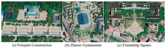 We evaluate the performance of the proposed global localization solution using three datasets collected from different scenarios, namely construction, gymnasium, and campus. These datasets were captured at Wuhan University, respectively around the Forepart Construction, inside and outside the Zhuoer Gymnasium, and around the Friendship Square, as depicted in Figure 7. They were sourced from four distinct heterogeneous platforms: unmanned aerial vehicle (UAV), terrestrial station, trolley, and handheld. Candidate co-view context descriptors generated by the pre-set base map were assigned to multi-robot systems to conduct local scanning for online or offline global localization purposes. The detailed information about the datasets can be found in Table 1.