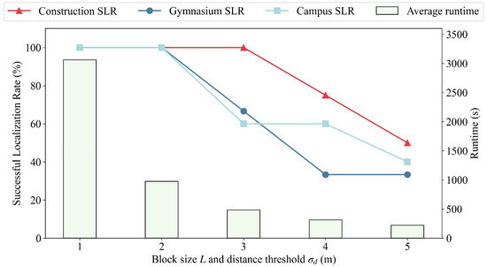 where and are predefined thresholds for rotation and translation errors, respectively. In this paper, they are set to 5.0° and 3.0 m, respectively. The SLR is then calculated as