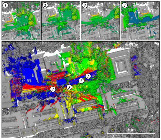 It is found that the rotation and translation errors range from 0.013° to 1.391° and from 0.058 m to 0.675 m, respectively. The rotation error between WHU-TLS heritage building 4 and WHU-TLS heritage building 5 stands out as significantly larger than others. This result stems from the symmetrical structure of the constructions, which causes the descriptors to be ambiguous in estimating the yaw angle. Moreover, the rotation and translation errors between the Square Self-built 2 and Square ALS point cloud are both large, with two underlying reasons. First, limited by sensor performance and SLAM algorithms, the local scan accuracy of Square Self-built 2 is inherently lower compared to scans captured by other scanning modes. In Figure 14, it is evident that the walls in Square Self-built 2 exhibit layering due to repeated scanning, which is not observed in the Square ALS point cloud. Second, the region of Square Self-built 2 is densely covered with trees that obscure the co-visibility between the aerial-based scan and the ground-based scan from different perspectives. These two factors together account for the significant error.