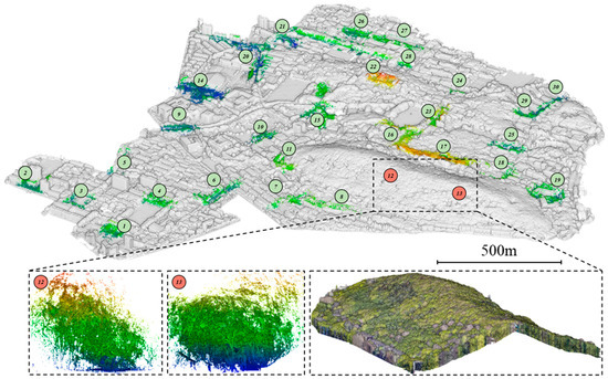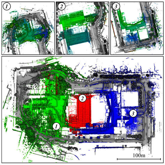 To validate the successful localization rate of our approach, a total of 30 evenly distributed local scans were additionally collected using a handheld Livox Mid-360 [57] laser scanning device on the campus of Wuhan University. These 30 local scans are globally localized with guidance from the ALS base map, as shown in Figure 13. The SLR is calculated according to Equation (17). Among these, 28 local scans are successfully globally localized, resulting in a successful localization rate of 93.3%.
