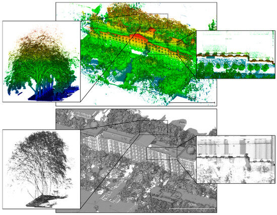 Comparison between Campus Self-built 2 and Campus ALS point cloud. The top figure shows the Campus Self-built 2 scan and its details. The bottom figure shows the Campus point cloud scan and its details.
