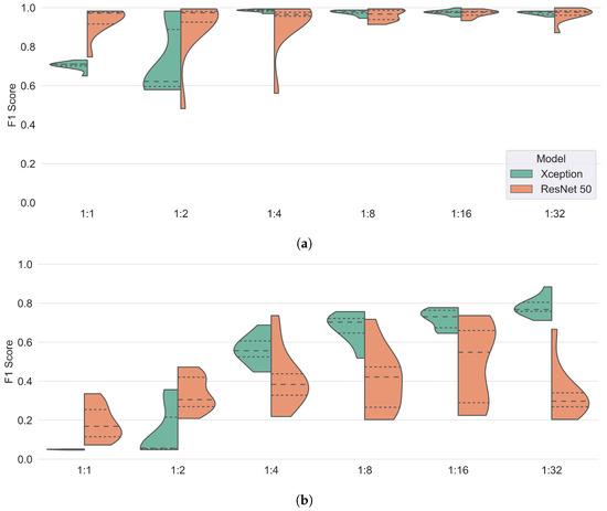 In most cases, Xception outperforms ResNet-50. We postulate that this is due to Xception being a smaller network and thus less prone to overfitting. Smaller networks have been shown to outperform larger CNNs in classifying sonar imagery [49]. Both networks tend to perform better overall when trained with higher imbalance ratios. This is likely due to a greater amount of data being used when training, allowing the network to more accurately model the background class. Figure 6a suggests the good performance of both models with the most imbalance ratios; however, due to the limited amount of available training data, k-fold cross-validation could not be properly performed and some data overlap between training, validation and test datasets could not be avoided during evaluation. This type of testing has been shown to be unreliable with small datasets [50]. A more representative assessment is shown in Figure 6c, where the best-performing models achieve F1 scores of 0.63 in object detection on unseen images. This moderate performance may also be due to the lack of sufficient training data. Additionally, the training and validation data used here have been collected from multiple trials and environments, yet the unseen data are from one environment only.