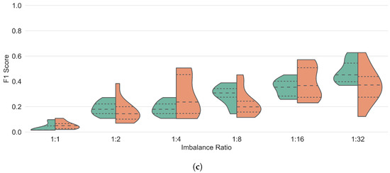 F1 scores of Xception and ResNet-50 for (a) classification on test data samples (image snippets), (b) object detection on full-size sonar images, (c) object detection on full-size sonar images from an unseen dataset, with increasing imbalance ratios. Lines show median and quartiles of distributions. Networks were re-trained 10 times each.