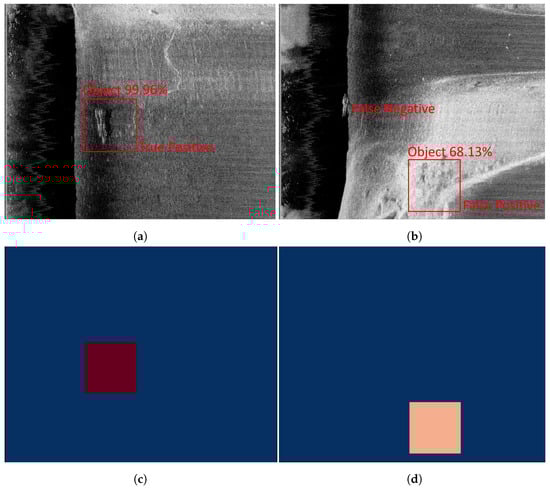 Examples of bounding box placement after object recognition. Left column (a,c) shows true positive detected with a high confidence rate, right column (b,d) shows false positive with moderate confidence rate and a false negative. Second row (c,d) shows corresponding heatmaps generated from the bounding box and confidence rate. Blue-white-red colour scale ranges from 0–100 and indicates confidence rate.