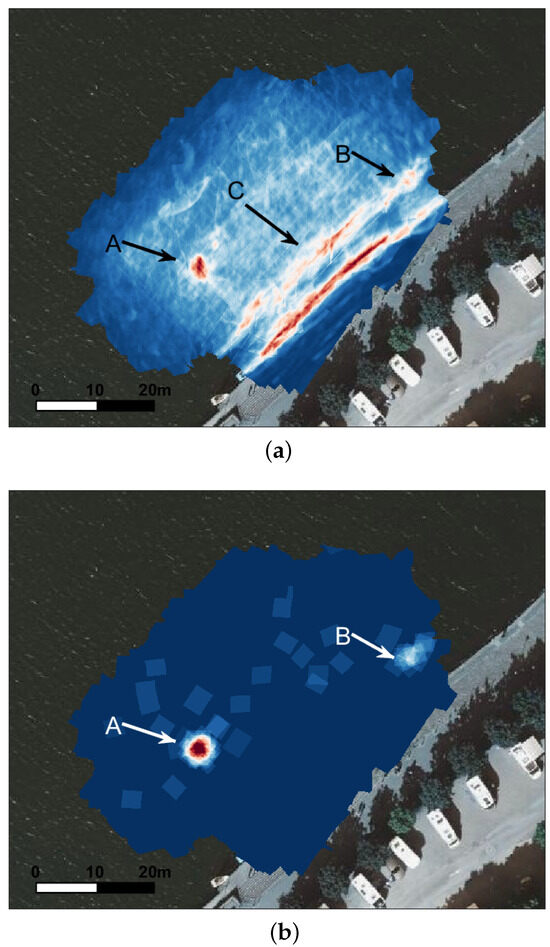 The best performing CNN from Table 5, i.e., Xception trained with an imbalance ratio of 1:32, was used to perform object detection on the unseen datasets. Detection examples and corresponding heatmaps are shown in Figure 8. Some detections are poor, incorrect, or missed altogether as seen in Figure 8b. With the average F1 score of this network on unseen data achieving only 0.47, the single look classification performance is poor. Each classification is view-dependent, with accuracy varying when viewing the scene from different orientations. Figure 9 illustrates how viewing the target object from an unfavourable orientation results in poor detection with the existing method, but nearby fish give a slightly stronger detection resulting in a false positive, see Figure 9b. The CNN-based approach results in a true positive detection for the target object but also incorrectly classifies the fish with high confidence, see Figure 9c. However, a good outcome is achieved by combining the results of multiple heatmaps, similar to an ensemble average of multiple weak classifications. Similar improvements to the classification of SSS images by using multiple looks of the same object have been demonstrated previously with dummy mines [51,52]. Figure 10b shows how the true target object position is clearly identified, with the impact of false negatives arising from transient objects such as fish suppressed. A secondary region with overlapping false positives of low confidence is also present, due to rocks on the seafloor. This result is a significant improvement over the existing method shown in Figure 10a, which shows two additional regions of interest due to the algorithm incorrectly identifying changes in seafloor texture and the water-land boundary as anomalies. Finally, Figure 11 illustrates the good repeatability of this method with the additional unseen dataset, with the target location clearly identified when deployed in a different position. The location of the rocks is less pronounced in this result, this could be due to underwater changes which may have occurred in the 16-month period between gathering the two datasets.