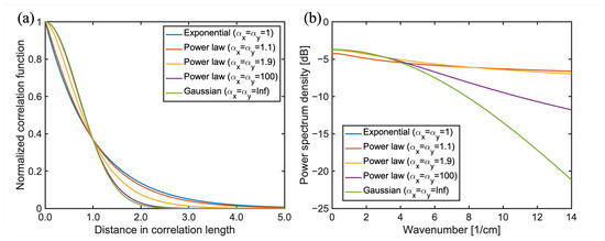 where denotes the surface RMS height for the i-th scale, and and are the correlation lengths along the x and y directions, respectively, for the i-th scale. The ratio between the RMS height and correlation length is correlated to the RMS slope. The scaling factors and control the power-law decaying rates in the x and y directions, respectively. The represents the Gamma function, and indicates the wavenumber domain. This model incorporates anisotropy and multiscale properties, providing a more accurate representation of the lunar surface roughness. The parameters , , , , and can be adjusted to capture the roughness characteristics across different scales, from fine to coarse features. The corresponding correlation function and roughness spectrum indexes cover a range of surfaces from Gaussian to exponentially correlated by adjusting these parameters. Figure 2 shows the correlation function and the corresponding roughness spectrum for different power indexes, illustrating the transition between Gaussian and exponentially correlated surfaces by adjusting the power index and .