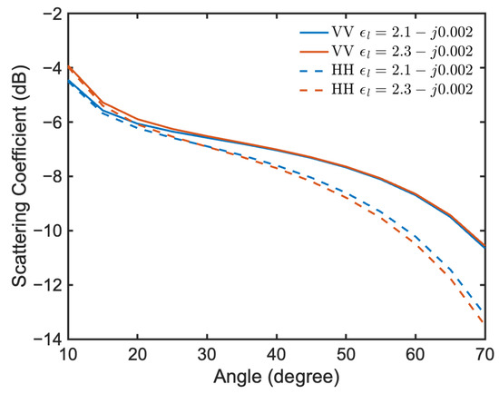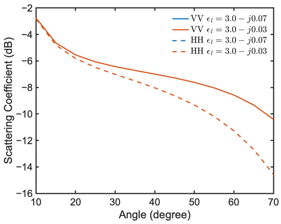We plot the scattering coefficients versus incident angle by setting the identical regolith layer parameters as in Figure 5, except the background dielectric constant . Figure 6 presents the scattering coefficients for and . It is expected that such a tiny change in the attenuation factor would not cause a visible change in the scattering coefficient. However, at the THz spectrum, detecting such small changes in the dielectric constant of the regolith layer from the scattering strength is difficult, if not impossible. One notable feature in the model is the loss of sensitivity in volume scattering to the specific shape of the scatterers when they are randomly oriented in the lunar regolith layer. Thus, for randomly oriented scatterers, volume scattering is not sensitive to the specific shape of the scatterer.