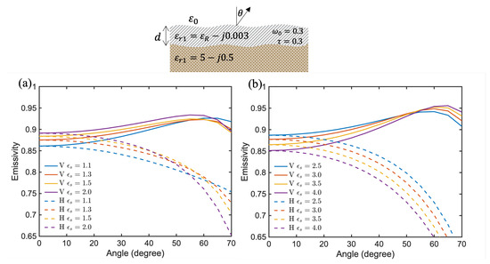 Effects of the real part of the layer dielectric constant on emissivity through a regolith layer with top and bottom rough boundaries. (a) and (b)