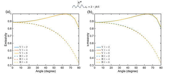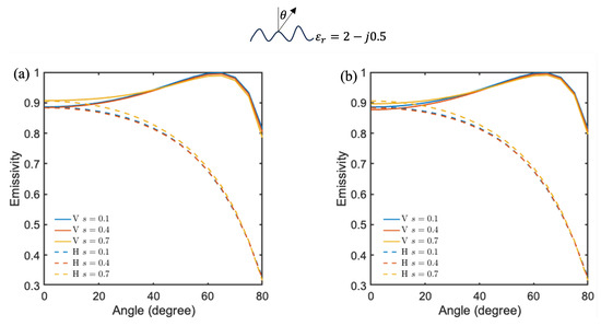 Comparison of emissivity from lunar regolith with different surface RMS height variations at 480 GHz using exponential and Gaussian correlation functions. (a) Exponential and (b) Gaussian.