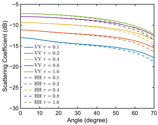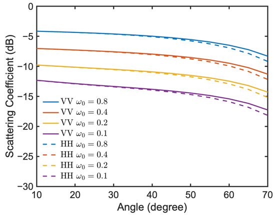 where A is the illuminated area and is the field coefficient, as detailed in [59,60]. The subscript represents polarization, with and for horizontal and vertical polarization, respectively. s is the surface RMS height. k is the wavenumber, with , , , and .
