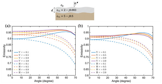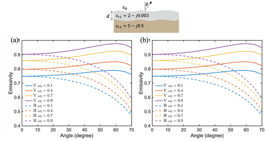 Figure 7 shows two sets of simulated emissivity curves. The first set has layer dielectric values of and , and the second set has and . Both cases have a background permittivity of at 480 GHz, with a top boundary roughness of , , and bottom boundary roughness of , . The albedo and optical depth values are both 0.3. From the simulation results in Figure 7, it is evident that surface emission is highly sensitive to changes in the dielectric constant, which can be influenced by variations in soil moisture. Additionally, H polarization is more sensitive to dielectric changes between 40 and 60 degrees, while V polarization is sensitive to dielectric changes at small observation angles.