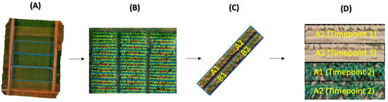 Overview schematic of the image preprocessing workflow: (A) Orthomosaic generation; Metashape (v2.0.1, Agisoft) was used to combine images taken from UAV platforms. (B) Visualisation of shapefiles on orthomosaics using QGIS (v3.28.7-Firenze, Free Software Foundation); shapefiles were generated using the plotshpcreate package on R software (v2022.12.0 + 353, Posit Software) and imported alongside their respective orthomosaic for each year in QGIS. (C) Cropped images generated from QGIS; individual plot images were cropped from aligned shapefiles using QGIS (v3.28.7-Firenze, Free Software Foundation) and were further rotated horizontally and split into four quadrants using a custom Python script. A1–2 and B1–2 represent replicates of the same hybrid lineage. (D) Final processed image; the quadrants corresponding to one replicate stacked on top of each other for all timepoints. Processed images will serve as inputs to the image-specific model, where the pixel values will used for feature extraction and model learning.